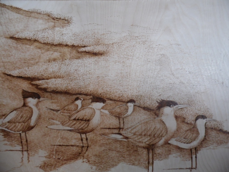 Today, my Burnt Offerings still utilize heat and wood to create unique and “one of a kind” artwork. The use of Birch wood with its tight grain, allows for intricate and extensive detail and texture. The marriage of the two mediums, pyrography and acrylic wash, greatly enhance the creation allowing you to touch the scales of a bass striking a plug, feel the plumage of a preening bird or touch the rocks beneath a wave washed lighthouse. Unlike many woodburning pieces, my work tends to be of a larger size, with most pieces being 12 x 24 to 18 x 24 with larger pieces available making them ideal for main wall hangings.”
