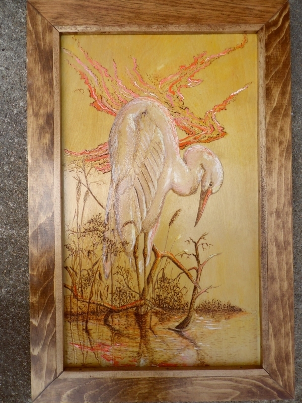 Today, my Burnt Offerings still utilize heat and wood to create unique and “one of a kind” artwork. The use of Birch wood with its tight grain, allows for intricate and extensive detail and texture. The marriage of the two mediums, pyrography and acrylic wash, greatly enhance the creation allowing you to touch the scales of a bass striking a plug, feel the plumage of a preening bird or touch the rocks beneath a wave washed lighthouse. Unlike many woodburning pieces, my work tends to be of a larger size, with most pieces being 12 x 24 to 18 x 24 with larger pieces available making them ideal for main wall hangings.”