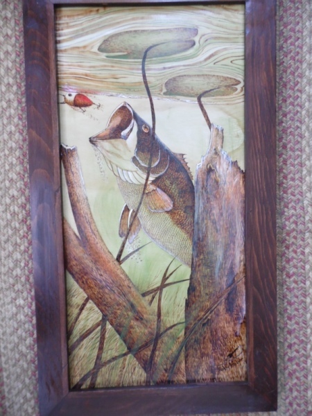 Today, my Burnt Offerings still utilize heat and wood to create unique and “one of a kind” artwork. The use of Birch wood with its tight grain, allows for intricate and extensive detail and texture. The marriage of the two mediums, pyrography and acrylic wash, greatly enhance the creation allowing you to touch the scales of a bass striking a plug, feel the plumage of a preening bird or touch the rocks beneath a wave washed lighthouse. Unlike many woodburning pieces, my work tends to be of a larger size, with most pieces being 12 x 24 to 18 x 24 with larger pieces available making them ideal for main wall hangings.”