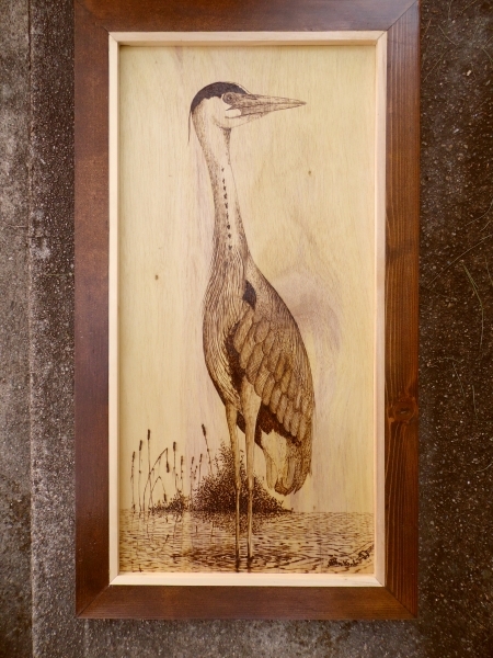Today, my Burnt Offerings still utilize heat and wood to create unique and “one of a kind” artwork. The use of Birch wood with its tight grain, allows for intricate and extensive detail and texture. The marriage of the two mediums, pyrography and acrylic wash, greatly enhance the creation allowing you to touch the scales of a bass striking a plug, feel the plumage of a preening bird or touch the rocks beneath a wave washed lighthouse. Unlike many woodburning pieces, my work tends to be of a larger size, with most pieces being 12 x 24 to 18 x 24 with larger pieces available making them ideal for main wall hangings.”