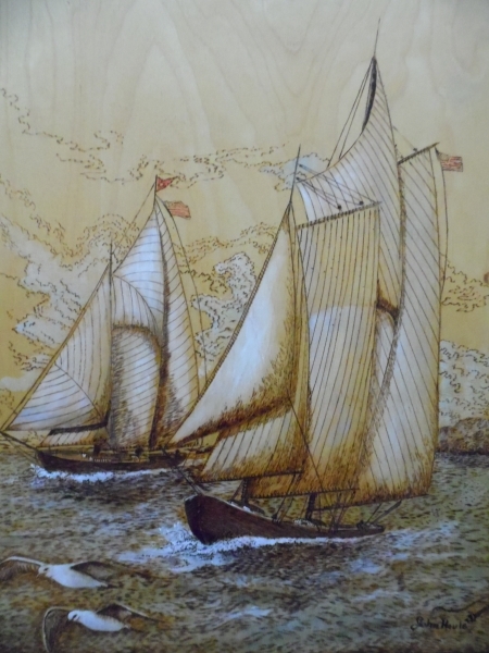 Today, my Burnt Offerings still utilize heat and wood to create unique and “one of a kind” artwork. The use of Birch wood with its tight grain, allows for intricate and extensive detail and texture. The marriage of the two mediums, pyrography and acrylic wash, greatly enhance the creation allowing you to touch the scales of a bass striking a plug, feel the plumage of a preening bird or touch the rocks beneath a wave washed lighthouse. Unlike many woodburning pieces, my work tends to be of a larger size, with most pieces being 12 x 24 to 18 x 24 with larger pieces available making them ideal for main wall hangings.”